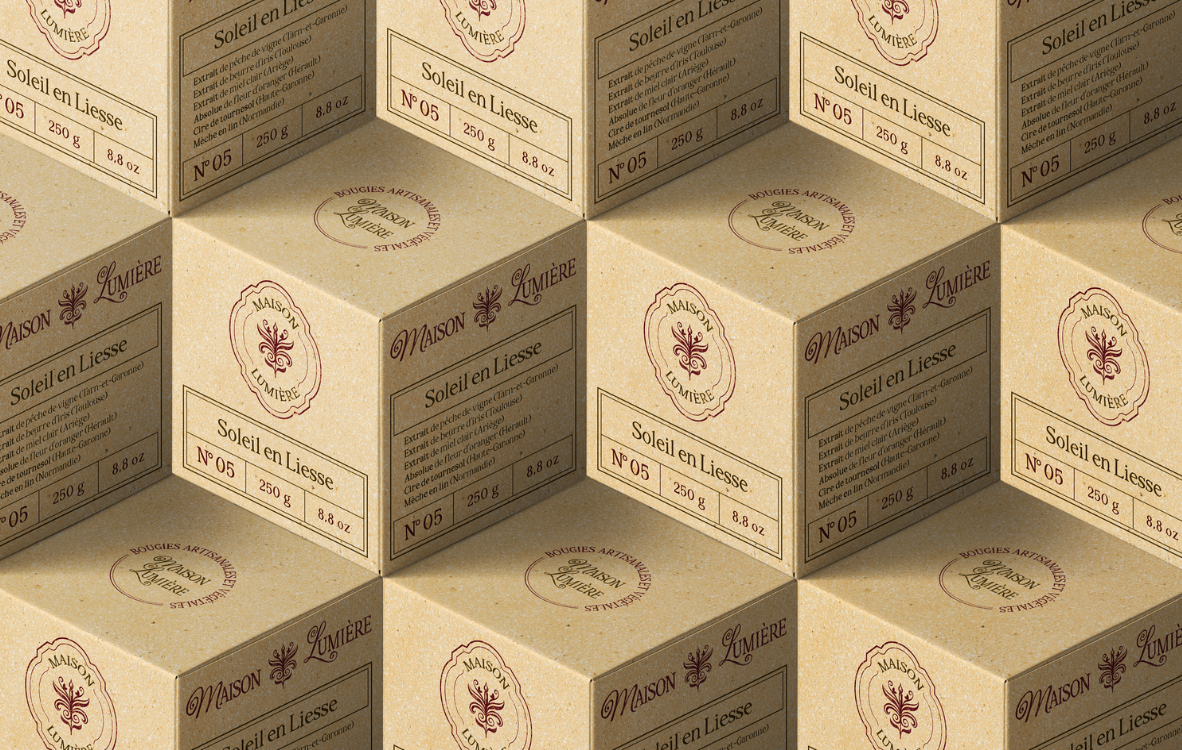 J’ai conçu les étiquettes et les packagings de Maison Lumière dans le même esprit. Des emballages éco-responsables, nécessitant peu de ressources à l’impression et facilement réutilisables ou recyclables. Avec très peu d’encre foncée et des éléments toujours linéaires, permettant d’économiser de l’encre, des ressources à l’impression et de faciliter le recyclage. Les packagings sont imprimés sur un papier végétal aux teintes naturelles. Ils suivent la direction artistique du style apothicaire, avec élégance et lisibilité.